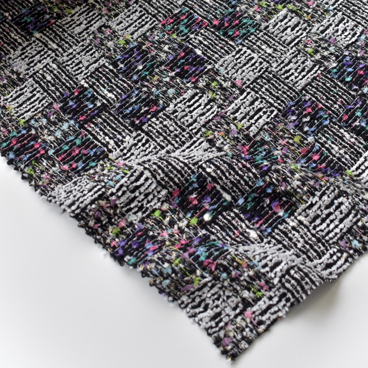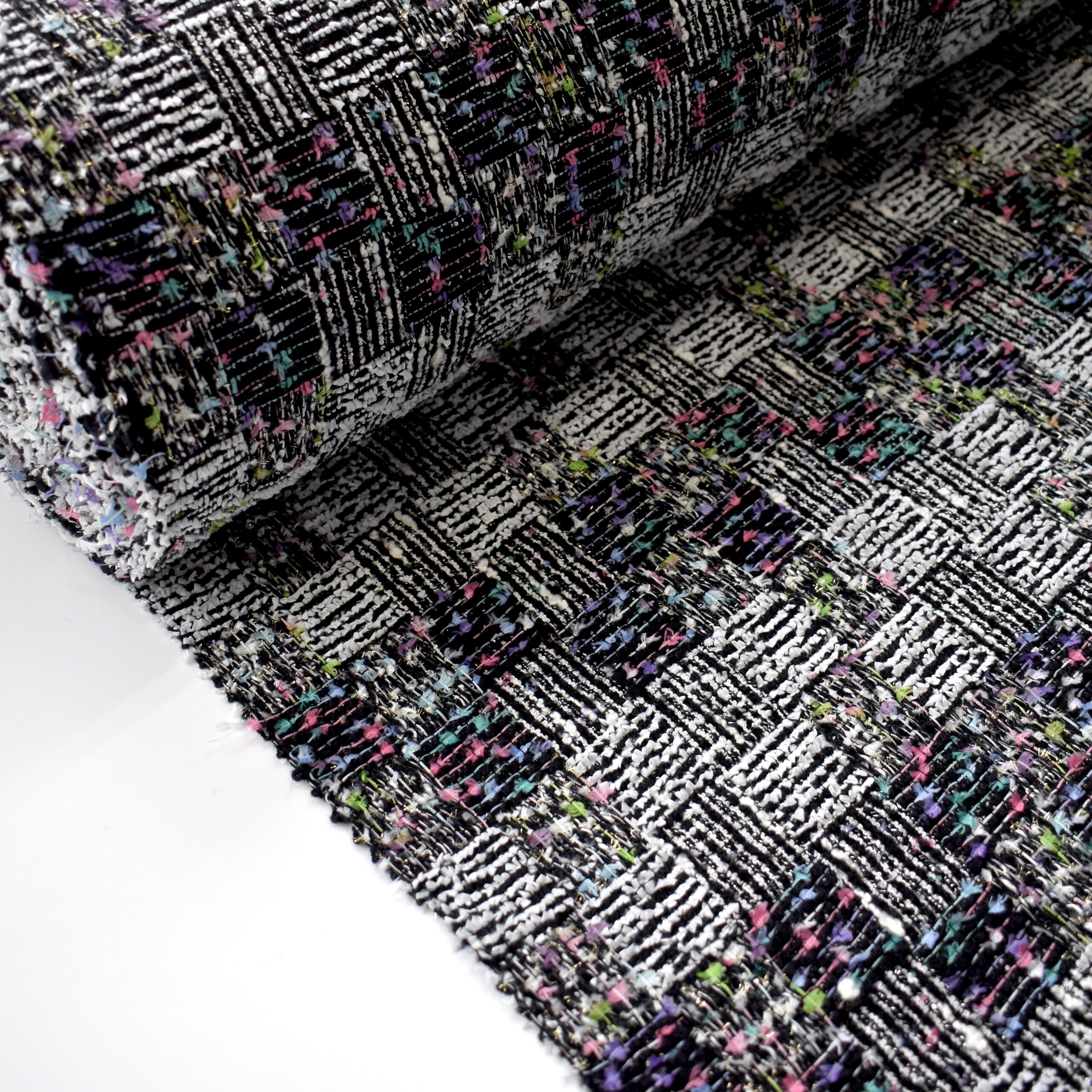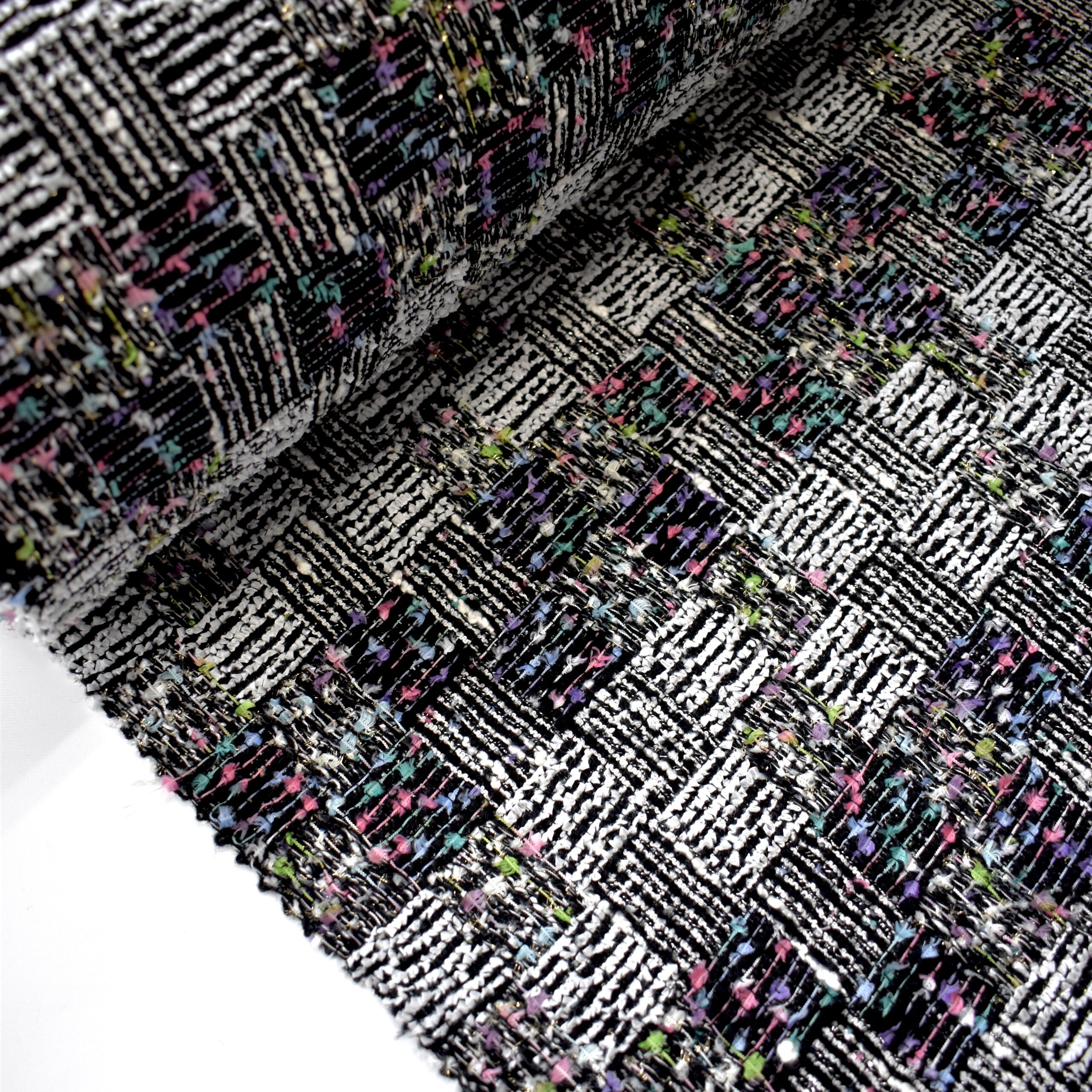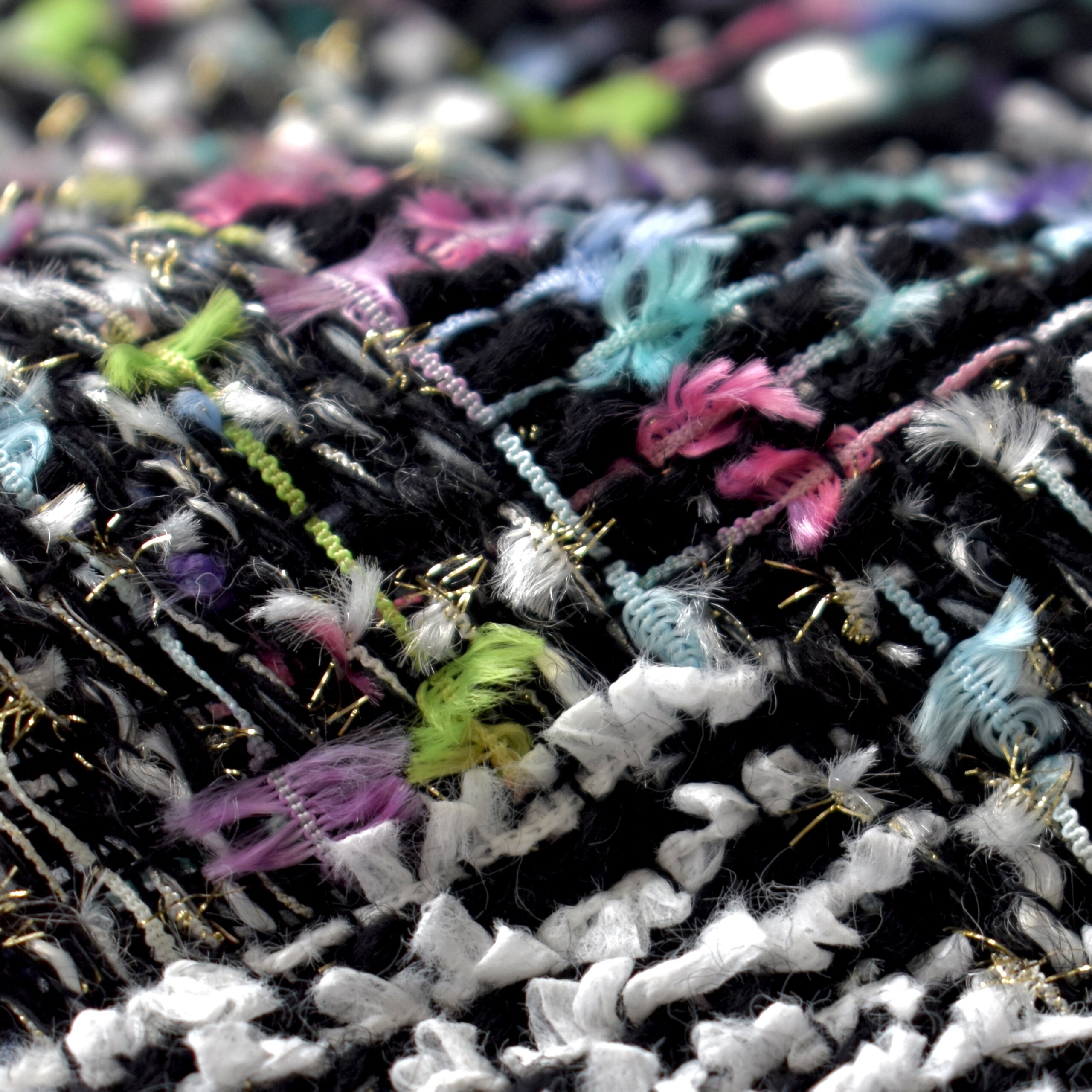 Terraced Fieldsとは段々畑の事です。まずはこのツイードの地組織は非常に複雑で組織を組んでいただいた職人さんに感謝いたします。 糸に関しては言葉が尽きません。大きく分けて10種類、細分化すると21種類にもおよびます。 カラーは13色使用しています。金、銀、パールやルビー、サファイア、エメラルド、アメジスト等王道のジュエリーカラーです。 本当に仕上がるまでには、気の遠くなる様な手間のかかっている貴重なツイードです。 *1つの区画の部分のタテはabout4.4cmです