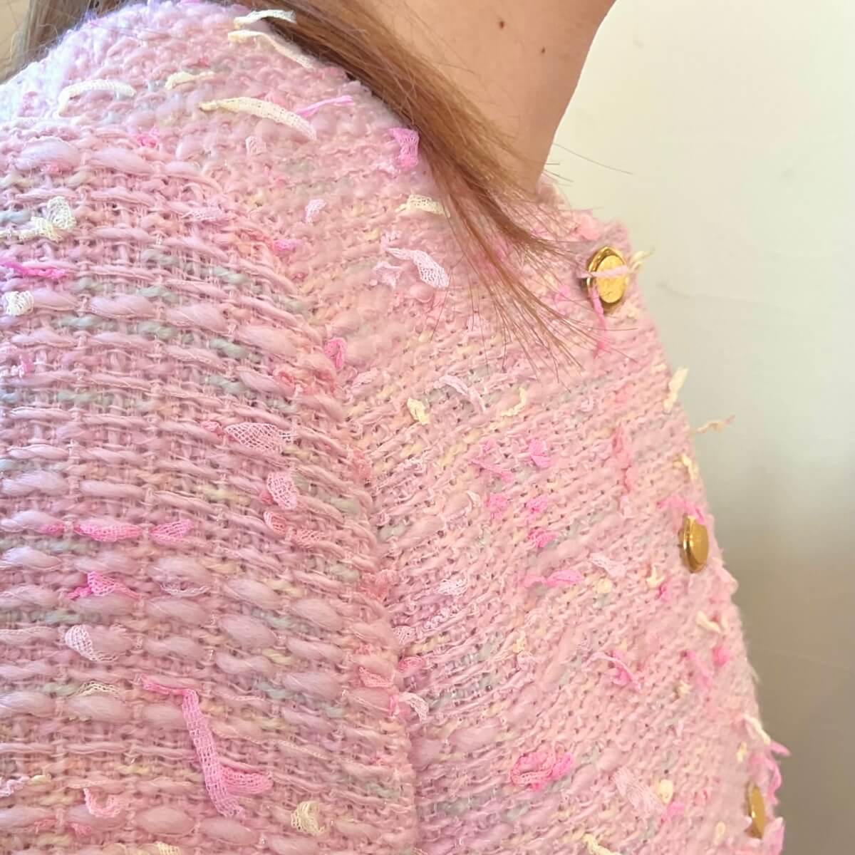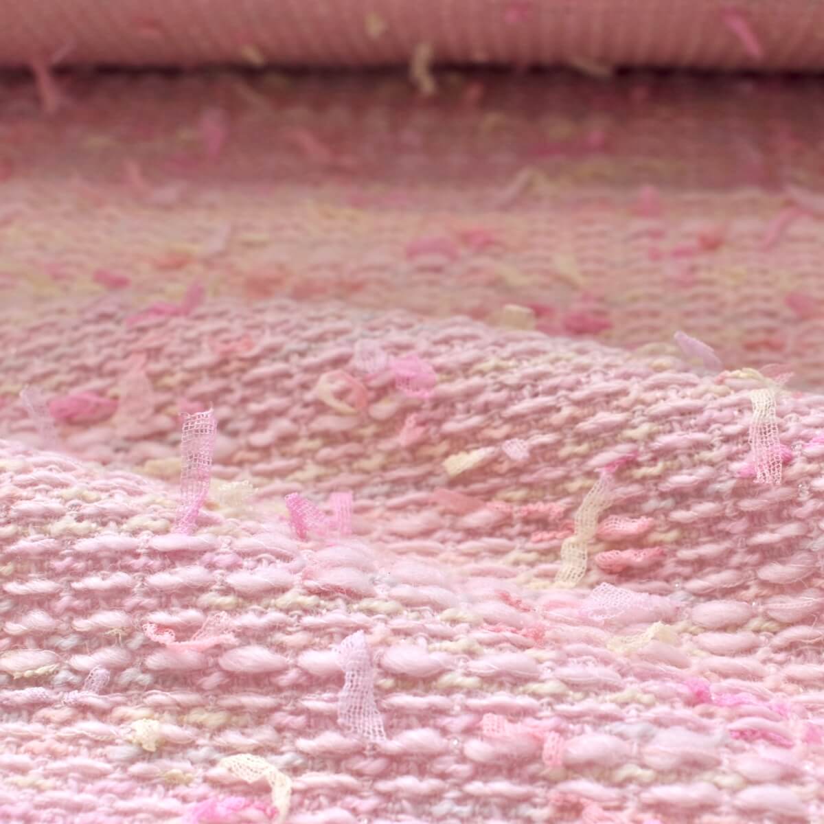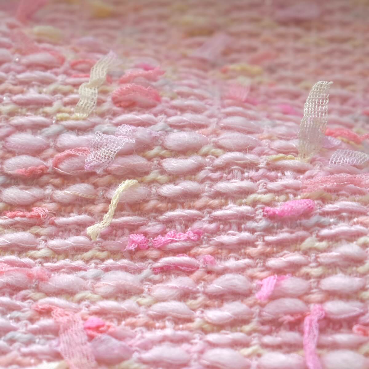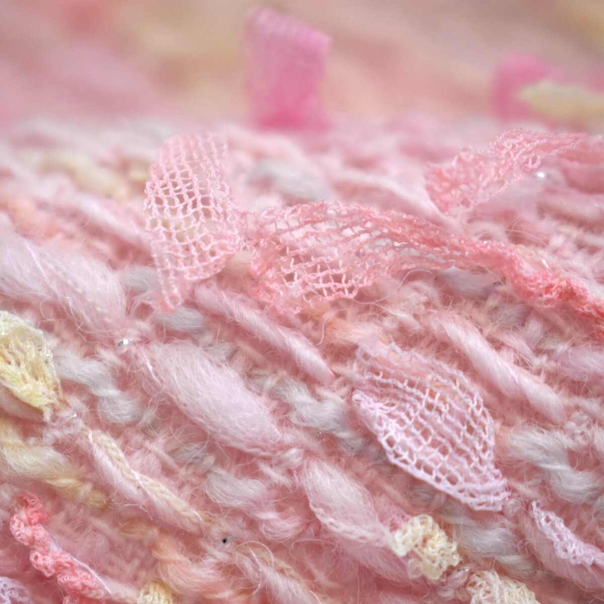 今回はウールベースで暖かい風合いのqualityです。特注のチュールテープラッセルロングリボンを可愛い花の色に絣染めにし、ベースの中にもウールトライスピンロービング糸もスモーキーな花の色に絣染めいたしました。この2色の色のハーモニーはまさに「花の二重奏」です。